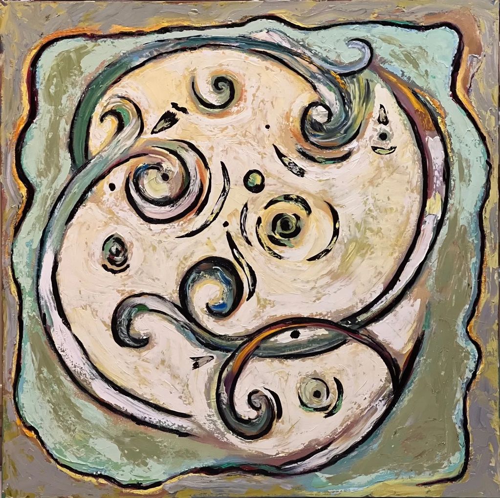 A delightful feeling boxed in a wobbly border.It's sometimes easier to express negativity, so I painted swirls of circles contained with a soft border